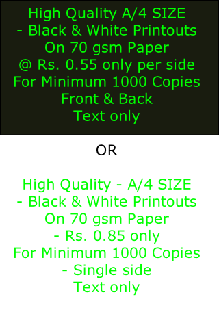 5. FOR 1000+ QTY NO FILE OF PAGES LESS THEN 20 WILL BE PRINTED AT ABOVE RATES FOR SMALL FILES Rs. 1 will be charged per side.